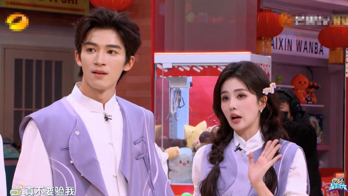 可偏偏有人硬生生把好局搅出怪味儿来。白鹿和王星越这对,打着《唐宫奇案之青雾风鸣》的旗号来宣传,互动却用力过猛到尴尬。那个靠脸答题的游戏,本就容易暧昧,王星越倒好,开场就深情凝视,搞得白鹿自己都忍不住吐槽“这么炙热的眼神吗”。更别提后面抽板子时,他非要用头发去蹭人家,握手更是死死不放,各种小动作频出,弹幕都惊了:“这手抓的,我亲弟都不敢这么放肆!”